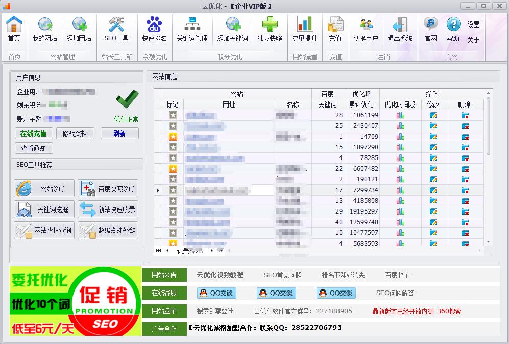 8运用云营销软件模拟点解,云营销软件是模拟人在百度检索框输入你想优化的关键词浏览你的网站,平均浏览网页量和平均浏览时间都有设置,而且IP地址都是不一样的。软件可以提升百度对网站关键词的关注度和友好度,从而使网站关键字排名迅速提升。